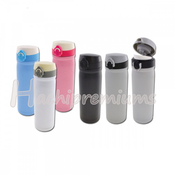 วัสดุ : กระบอกน้ำสแตนเลส ทรงกระบอกสูง ฝาเปิด-ปิด มีตัวล็อคมือและมีปุ่มกดเปิด