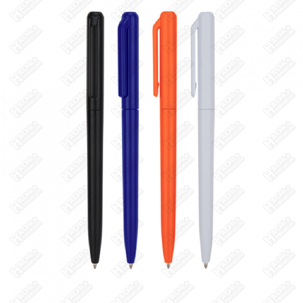 ลักษณะ : ปากกาลูกลื่น ปากกาพลาสติกเปิดปิดแบบหมุนตรงปลายด้าม ตัวด้ามเป็นพลาสติกสีทึบ สีเดียวกันทั้งด้าม ตัวด้ามมีขนาดเล็กจับถนัดมือ